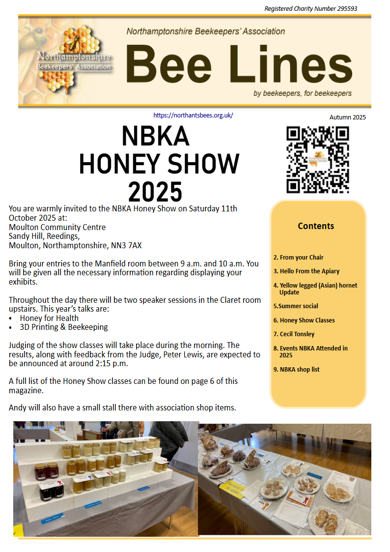Regular features include reports from the chair, training officer, apiary manager, and events coordinator.